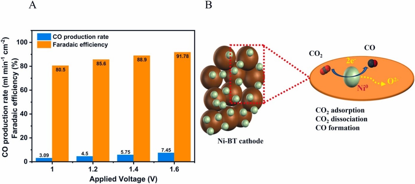图2. soec电池的co2电解性能(a: co产率和对应的法拉第效率,b: ni -玄武岩阴极的co2 - rr示意图)。