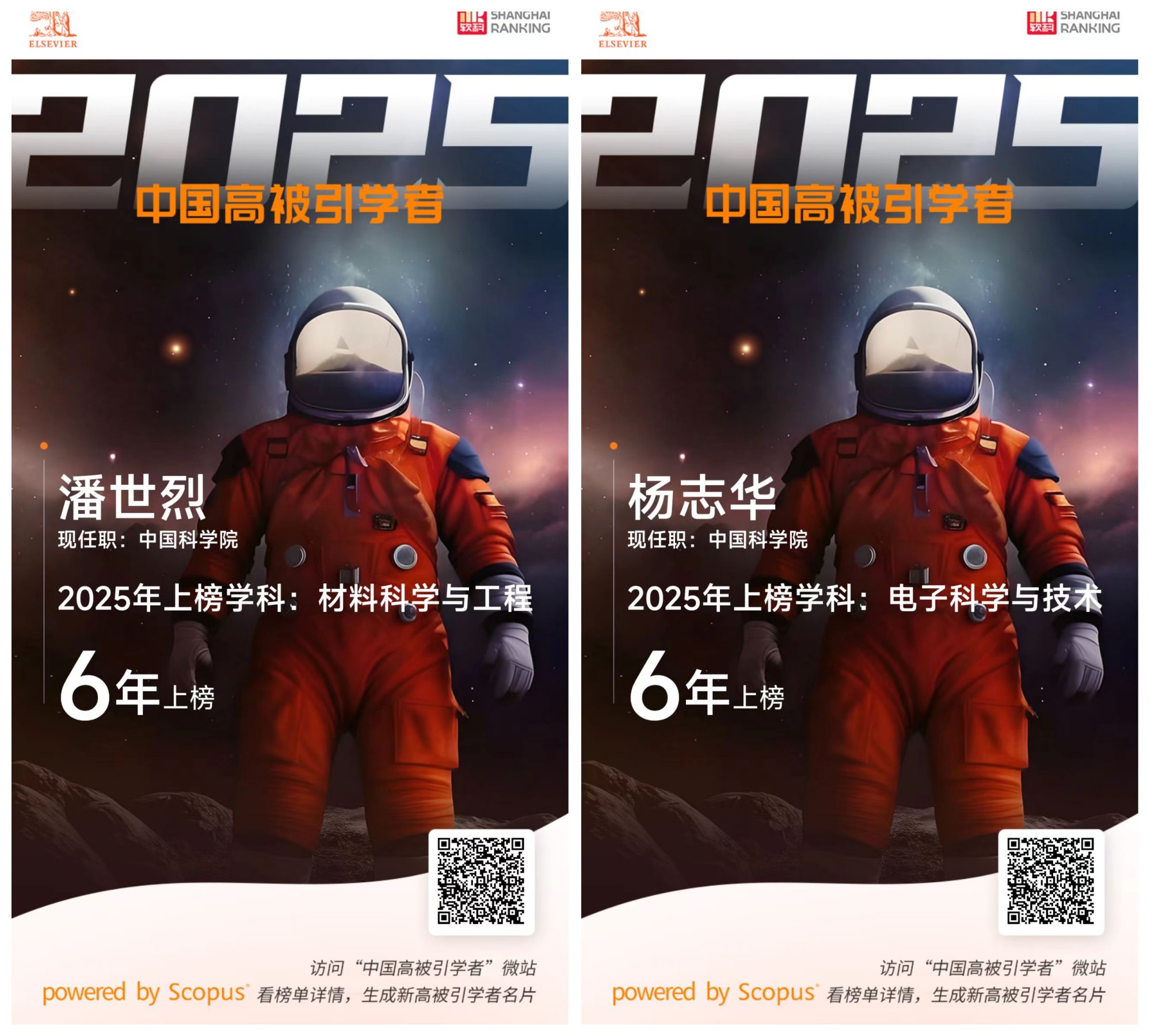 1月30日,爱思唯尔(elsevier)正式发布2025年“中国高被引学者” (highly cited chinese researchers)榜单。新疆理化所所长潘世烈研究员和杨志华研究员再度上榜,这是他们连续第6年入选该榜单。